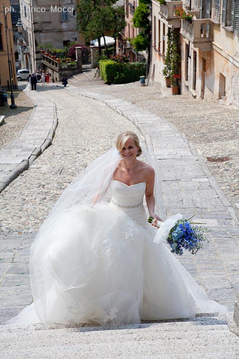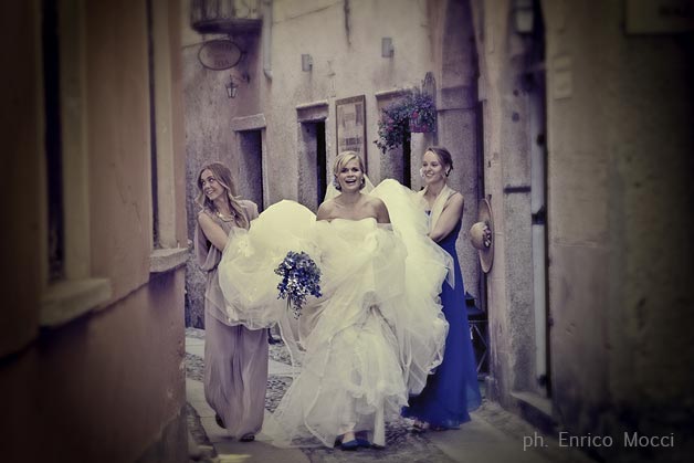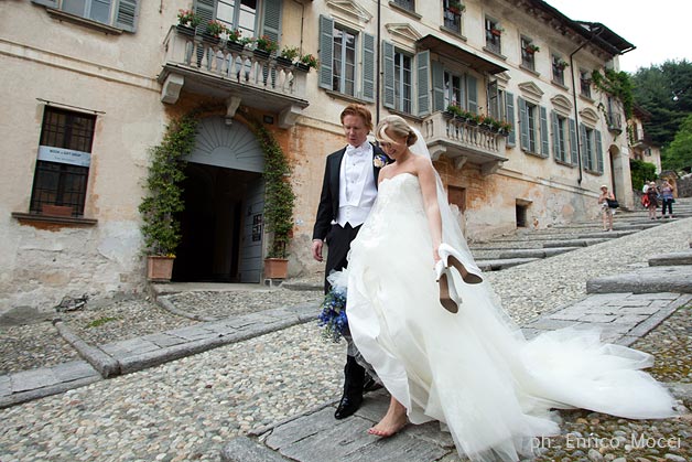 Da notare l’intrepida scelta della sposa di camminare per le vie di Orta a piedi nudi!